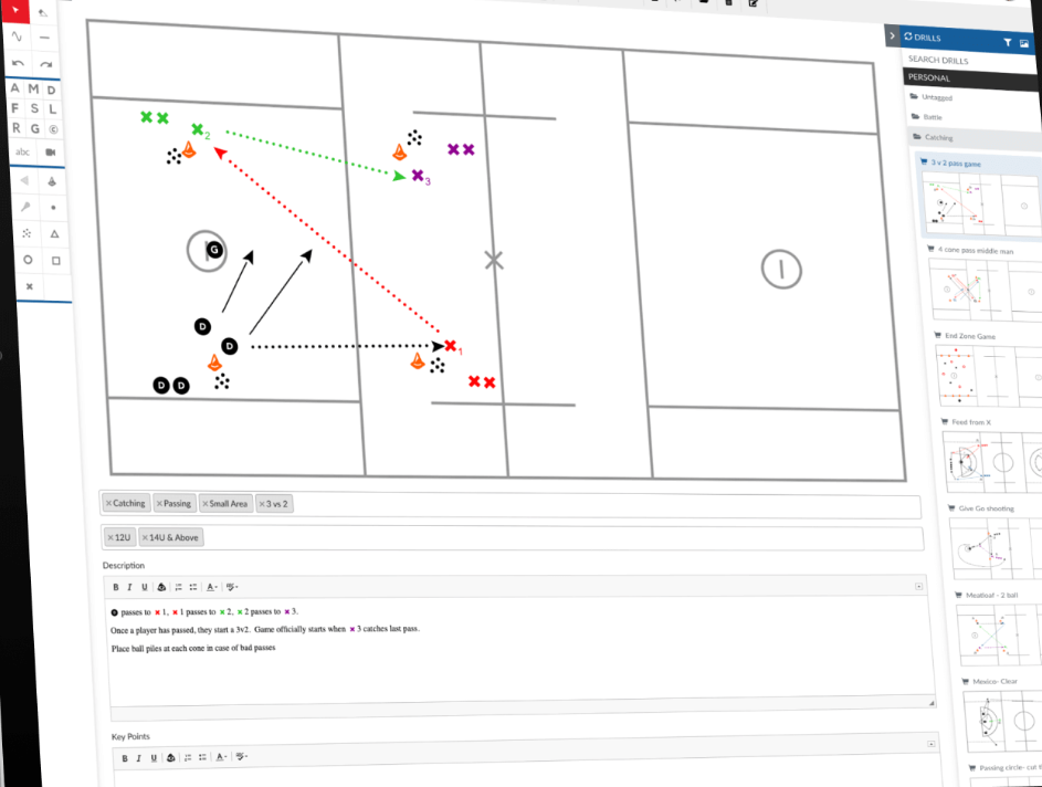 The Drag-and-Drop Playbook Builder is CoachThem’s core engine for lacrosse, letting you create full plays, sets, rides, clears, man-up/man-down, and drills in seconds with pre-loaded men’s and women’s field templates, lacrosse-specific player icons, ball paths, and annotations—all included in every plan (free tier available). Drag players onto the field, draw offensive routes, defensive slides, or transition paths with smart snapping, add text/notes/arrows, and generate clean, professional visuals instantly.